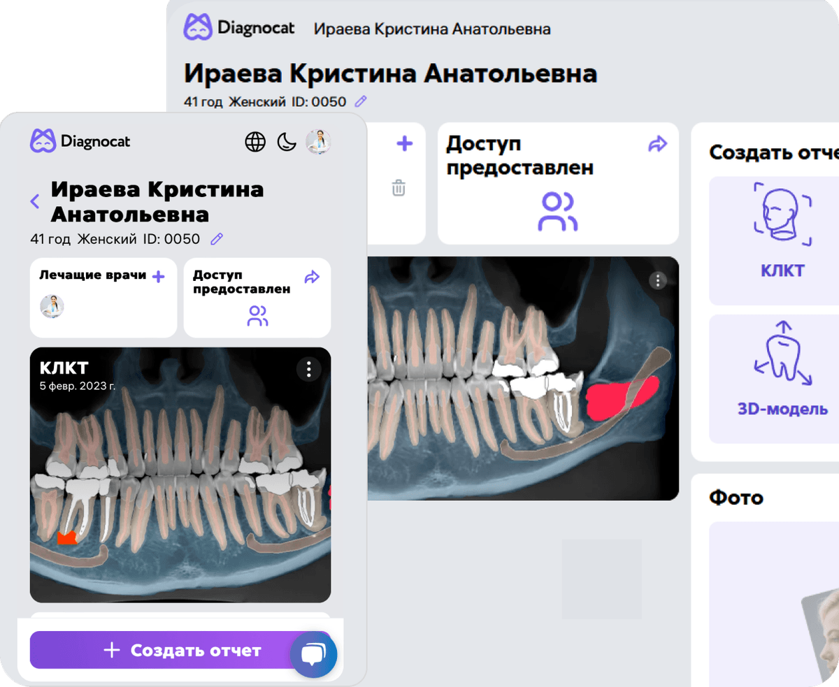 Diagnocat создает детализированные отчеты по КЛКТ, панорамным и внутриротовым снимкам. Наглядные отчеты улучшают взаимодействие с пациентами, уменьшают их тревожность и повышают мотивацию на лечение.
