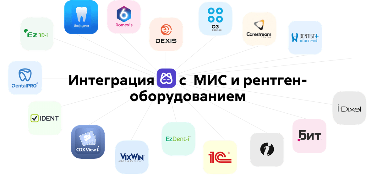 Прямая интеграция c информационной системой вашей клиники, рентгенологическим оборудованием, интраоральными сканерами – все данные в едином интерфейсе.